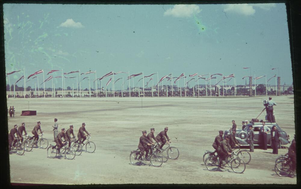 Latvijas Aizsargu organizācijas 20 gadu jubilejas svinību parāde Uzvaras laukumā. Parādes gājienā aizsargu riteņbraucēji.