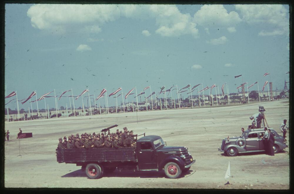 Latvijas Aizsargu organizācijas 20 gadu jubilejas svinību parāde Uzvaras laukumā. Parādes gājienā aizsargu motorizētās vienības.