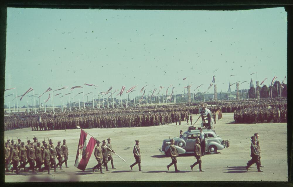 Latvijas Aizsargu organizācijas 20 gadu jubilejas svinību parāde Uzvaras laukumā. Parādes gājienā 1. Talsu aizsargu pulks.