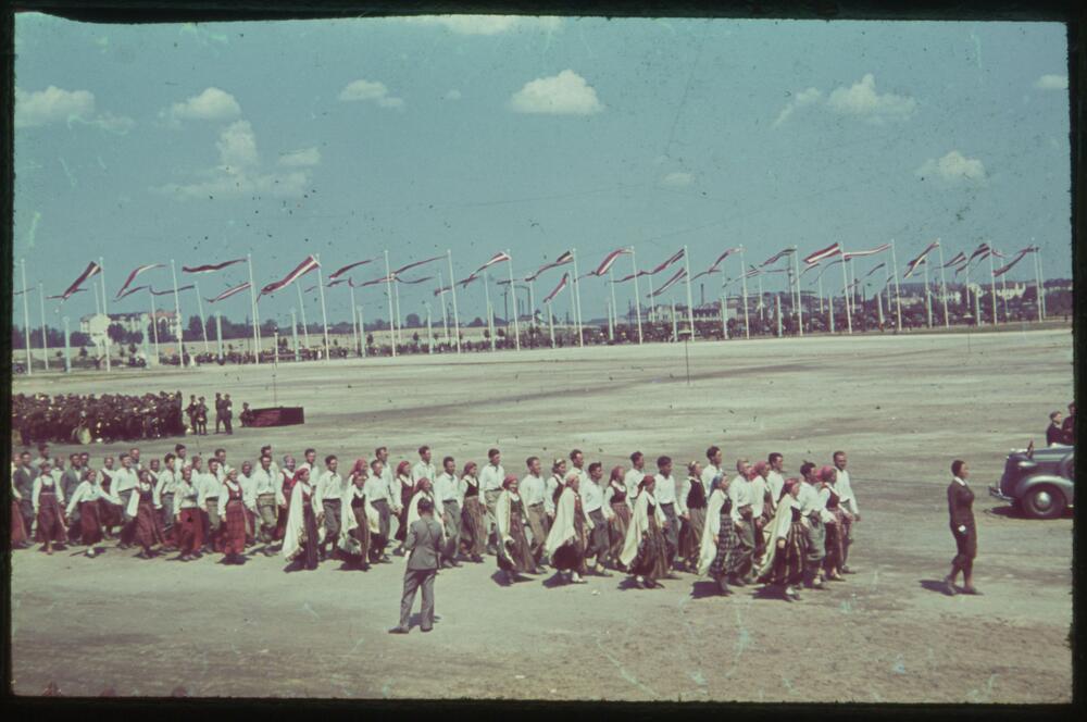 Latvijas Aizsargu organizācijas 20 gadu jubilejas svinību parāde Uzvaras laukumā. Parādes gājienā aizsargu pulciņu tautisko deju dejotāji.