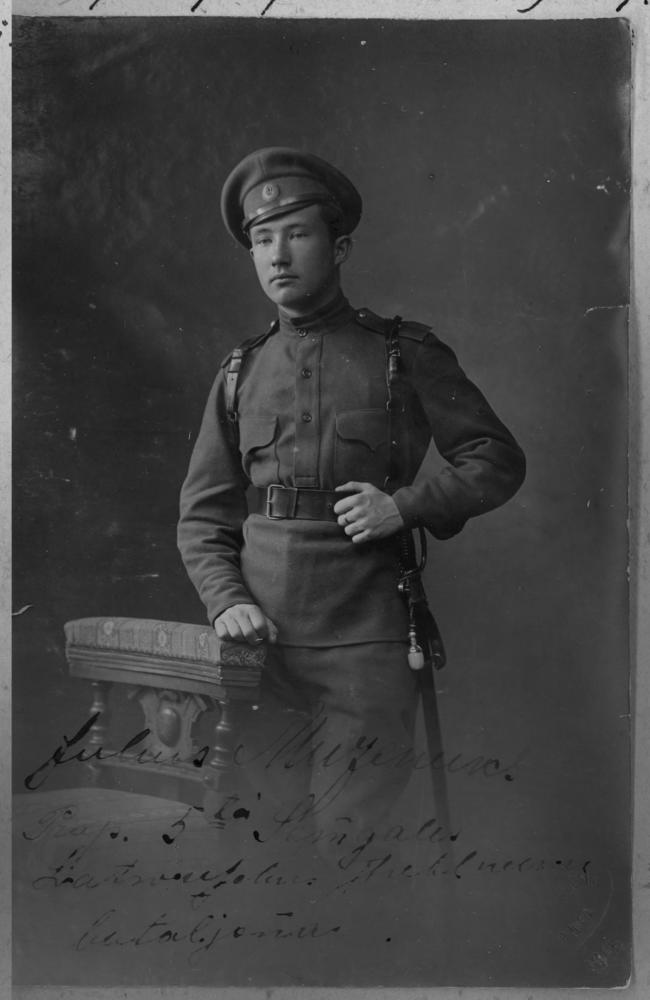 Krievijas impērijas armijas 5. Zemgales latviešu strēlnieku bataljona 4.rotas praporščiks Jūlijs Mucenieks (dzimis 1894. gada 2. decembrī Vidzemē, Gaujienas Jaunlaukos (?)). Pabeidzis Smiltenes tirdzniecības skolu. Pakāpe saņēma 1915. gada 15. novembrī. Portrets.