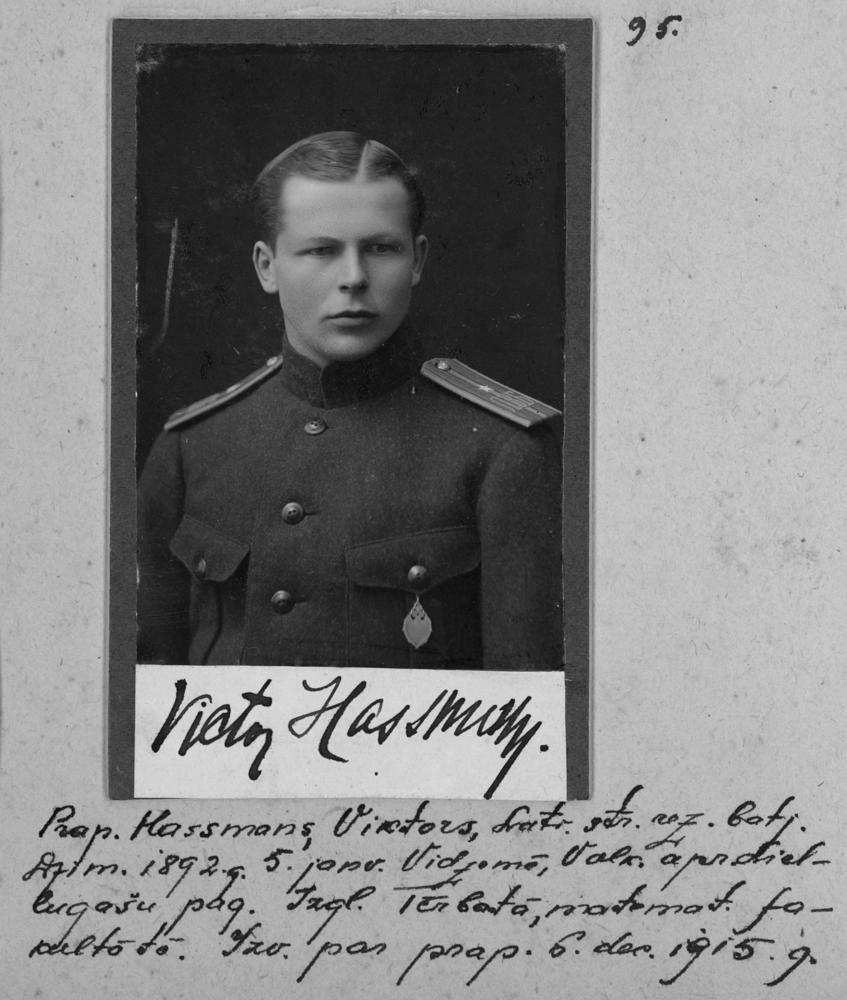 Krievijas impērijas armijas Latviešu strēlnieku rezerves bataljona praporščiks Viktors Hassmans (dzimis 1892. gada 5. janvārī Valkas apriņķī Liel - Lugažu pagastā (tagad Lugažu pagasts)) Mācījies Tērbatas universitātes Metemātikas fakultātē. Pakāpi saņēma 1915. gada 6. decembrī. Portrets.