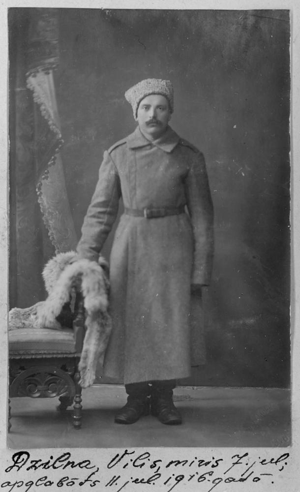 Krievijas impērijas armijas 6. Tukuma latviešu strēlnieku bataljona strēlnieks Vilis Dzilna, kas ievainots kaujā pie Ķekavas 28 gadu vecumā, miris 1916. gada 7. jūlijā un apglabāts Rīgas Brāļu kapos 1916. gada 11. jūlijā. Portrets.