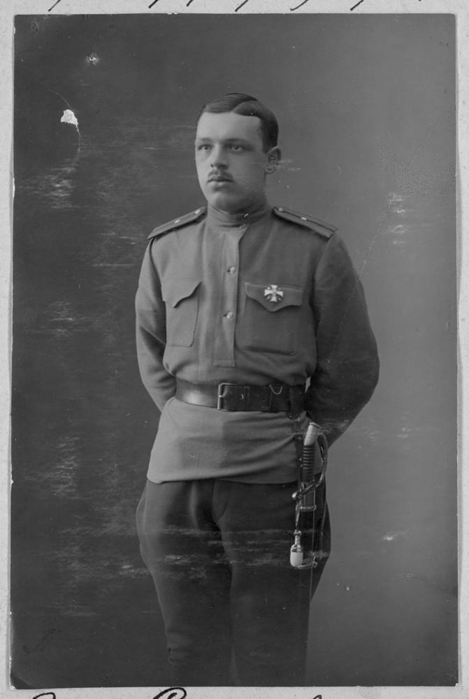 Krievijas impērijas armijas 3. Kurzemes latviešu strēlnieku bataljona 3. rotas praporščiks Juris Caune (dzimis 1894. gada 29. septembrī). Vidusskolas izglītība. Pakāpe no 1916. gada 1. janvāra. Portrets.