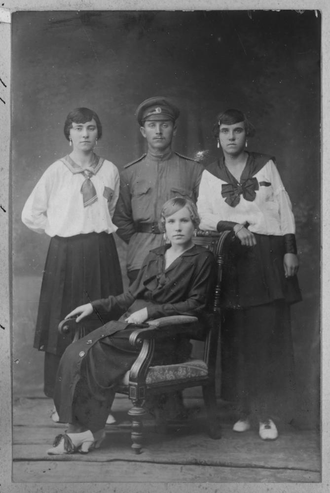 Krievijas impērijas armijas 1. Daugavgrīvas latviešu strēlnieku bataljona (?) strēlnieks Žanis Upītis Jāņa dēls (dzimis 1896. gada 11. decembrī Rīgā, dzīvoja Valkas apriņķa Dauguļu pagastā, izglītojies pamatskolā) Kritis kaujā pie Ķekavas 1915. gada (?) 25. oktobrī. Foto studijā, centrā strēlnieks un trīs jaunas sievietes. Grupas foto.