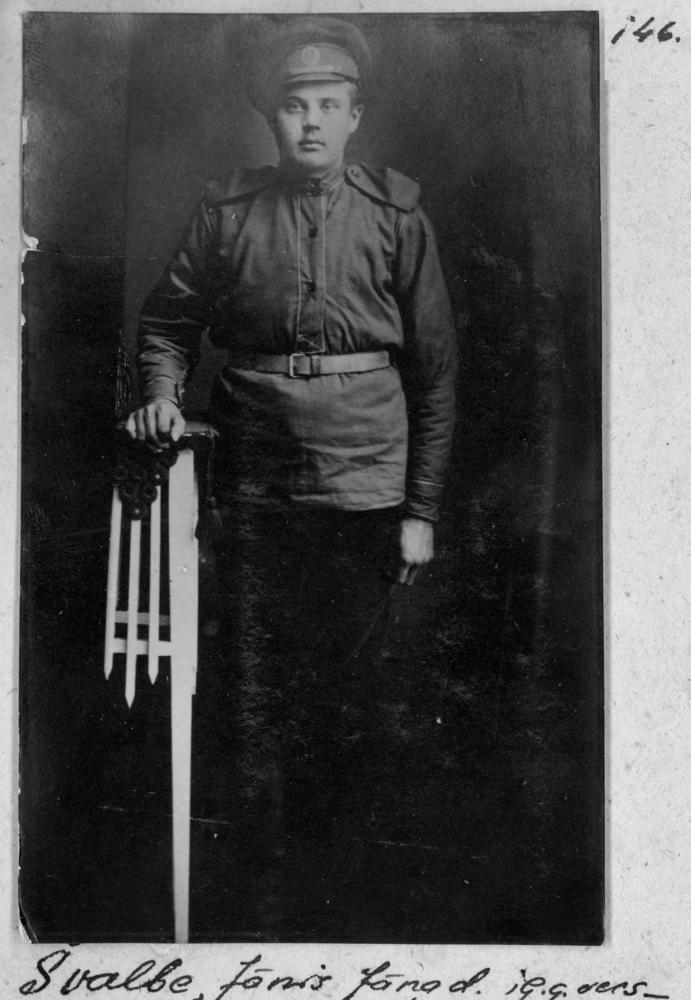 Krievijas impērijas armijas 2. Rīgas latviešu strēlnieku bataljona strēlnieks Jānis Švalbe Jāņa dēls . Draudzes skolas izglītība, dārznieks. 19 gadu vecumā kritis kaujās pie Slokas 1915. gada 28. oktobrī. Portrets.