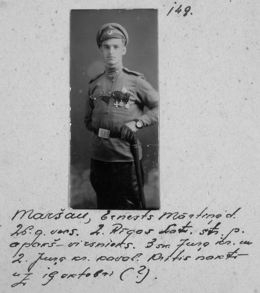 Krievijas impērijas armijas 2. Rīgas latviešu strēlnieku bataljona praporščiks Ernests Gothards Maršals Mārtiņa dēls (dzimis 1890. gadā 28. februārī Rīgā). Izglītojies pilsētas reālskolā, pēc tam Dubura dramatiskajos kursos. Aktieri. 1916. gada 19. oktobrī kritis gūstā, bēdzis, bet atbrīvots no Špandavas cietoksņa Berlīnē tikai 1918. gadā. Latvijas armijā iestājies brīvprātīgi 1918. gada 24. decembrī kapteiņa Skujiņa formētajā 2. Rīgas zemessargu rotā. varonīgi cīnījās pret Bermonta karaspēku 7. Siguldas kājnieku pulka sastāvā par Rīgu un Jelgavu, kā arī piedalījās karadarbībā Latgalē. Starpkaru periodā turpināja dienestu Latvijas armijā, paaugstināts par virsleitnantu. 1927. gadā beidzis virsnieku kursus. 1931. gada martā pārcelts uz 5. Cēsu kājnieku pulku. 1941. gadā deportēts un 1942. gada 28. janvārī Kulojlagā (Krievija) nošauts. Apbalvots ar Svētā Jura 3. un 4. šķiras krustiem divreiz (4 ordeņi). Lāčplēša kara ordeņa kavalieris. Portrets.