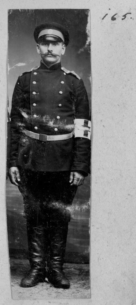 Krievijas impērijas armijas latviešu strēlnieku bataljona strēlnieks, ar sanitāra apsēju uz rokas. Portrets.