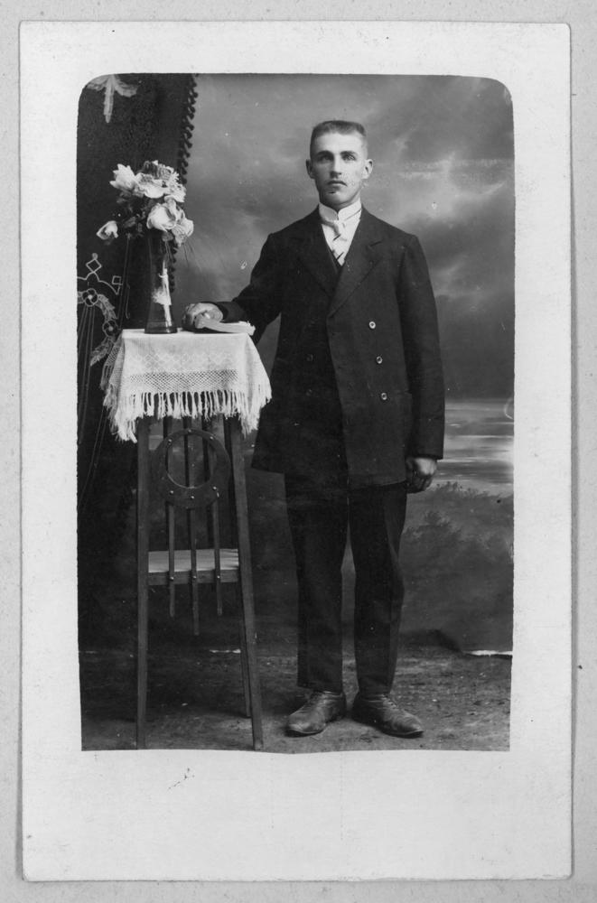 Viens no brīvprātīgajiem Krievijas impērijas armijas jaunveidotā latviešu strēlnieku bataljonā. Portrets studijā.