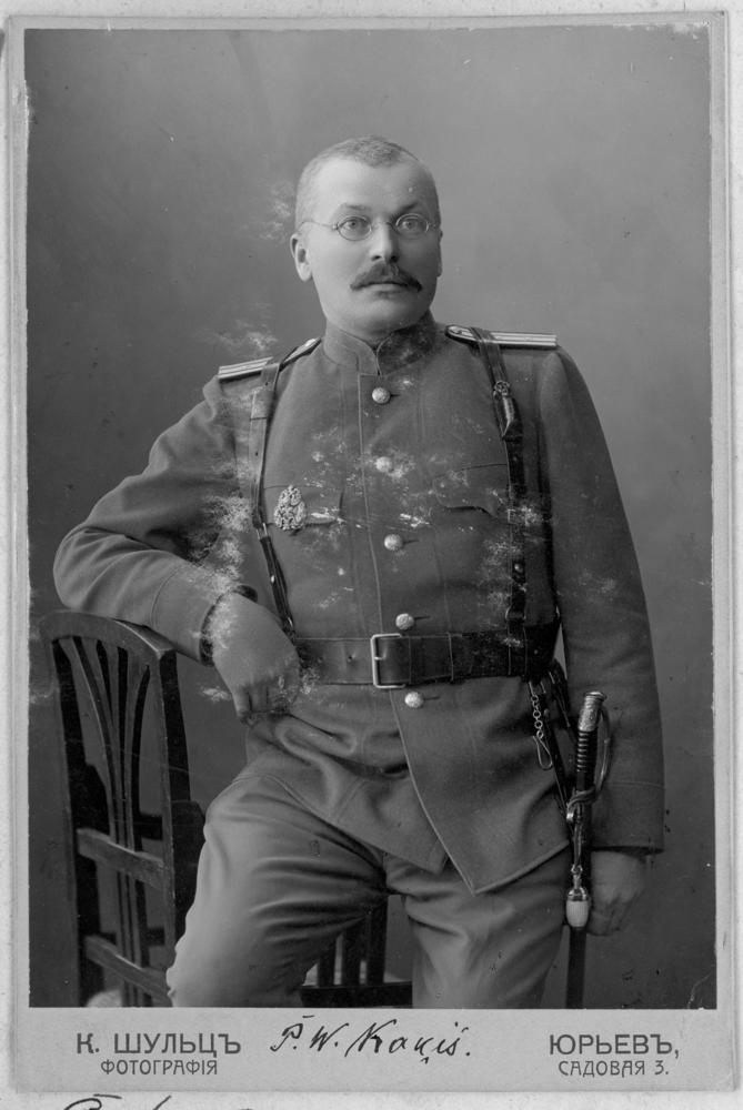 Krievijas impērijas armijas Latviešu strēlnieku rezerves bataljona ārsts Pēteris Voldemārs Kaķis (dzimis 1878. gada 8. aprīlī Vidzemē, Trikātas draudzē). Izglītība - Trikātas draudzes skola, Rīgas pilsētas ģimnāzija (1898) un Tērbatas universitātes Medicīnas fakultāte (1904). 1915. gada augustā viņš mobilizēts armijā un ieskaitīts Petrogradas (tagad Sanktpēterburga) kara sanitārās apgādes rezervē, bet mēnesi vēlāk iecelts par 10. ķīmiskās komandas ārstu. 1915. gada 20. septembrī iestājās par ārstu gaisa lidotājiem (?) Latviešu strēlnieku rezerves bataljonā, bet no 3. decembra par vecāko ārstu Latviešu strēlnieku rezerves bataljonā. No armijas atvaļināts 1918. gada februārī kā pulkvedis - leitnants. Strādāja par ārstu Ārlavā, Talsu apriņķī, Valmierā, Ziemeļlatvijas brigādes lazaretē un bija Valmieras apriņķa ārsts un kopējās slimo kases kontrolārsts. Apbalvots ar 4. šķiras Triju Zvaigžņu ordeni. Portrets.