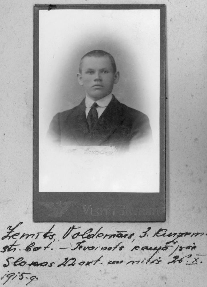 Krievijas impērijas armijas 3. Kurzemes latviešu strēlnieku bataljona strēlnieks Voldemārs Zemītis Pētera dēls (dzimis 1896. gada 19. janvārī, Kurzemē, Valčovas (?) pagastā, Jēkabmiesta (tagad Jēkabpils) apriņķī). 1915. gada 5. augustā iestājās kā brīvprātīgais Latviešu strēlnieku bataljonā, ievainots tā paša gada 22. oktobrī kaujās pie Slokas un miris 26. oktobrī, apglabāts Rīgas Brāļu kapos. Portrets.