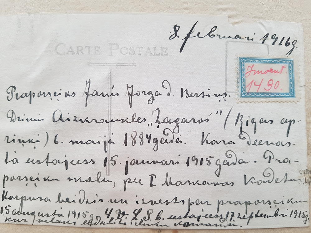 Krievijas impērijas armijas 4. Vidzemes latviešu strēlnieku bataljona praporščika Jāņa Bērziņa anketa rakstīta ar tinti uz pasta kartes. Fotokopija.