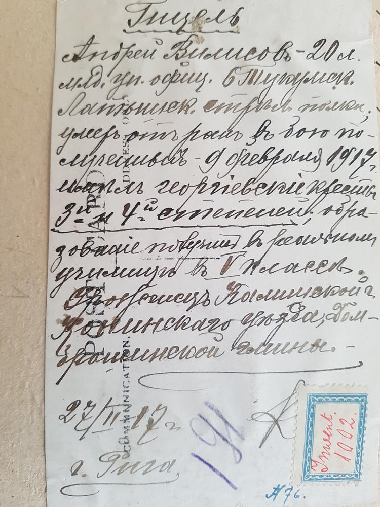 Krievijas impērijas armijas 6. Tukuma latviešu strēlnieku bataljona jaunākā apakšvirsnieka Andreja Hitceļa (Gicelis ?) ar tinti rakstīta krievu valodā anketa. Fotokopija.