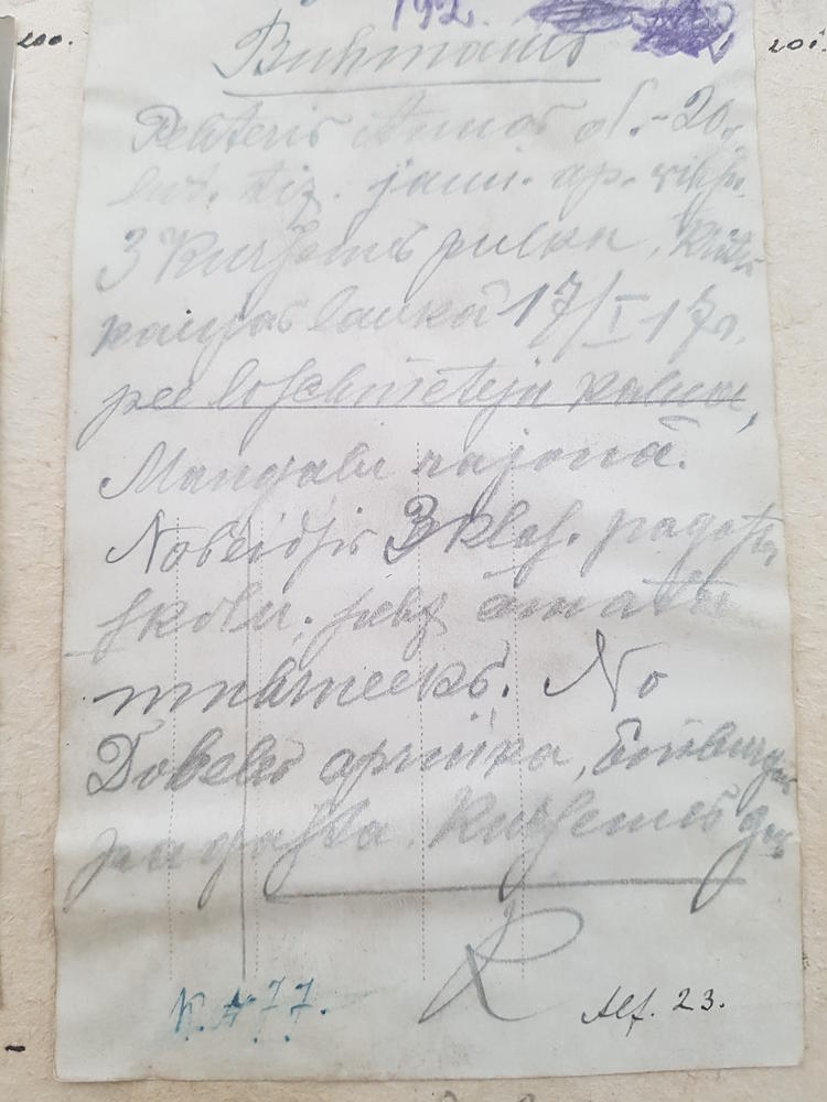 Krievijas impērijas armijas 3. Kurzemes latviešu strēlnieku bataljona jaunākā apakšvirsnieka Pētera Būmaņa ar zīmuli rakstītā anketa latviešu valodā. Fotokopija.