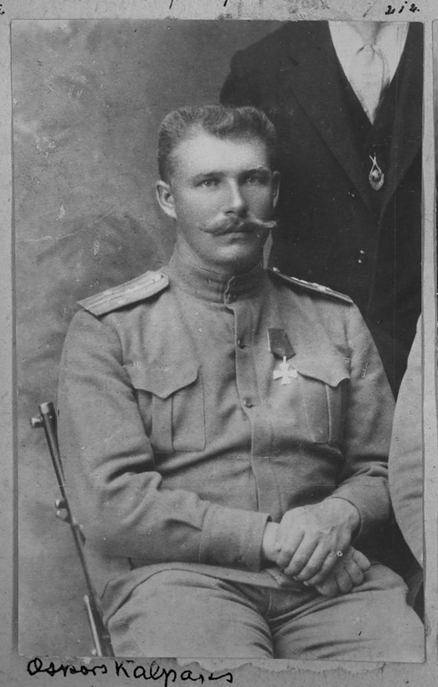 Pulkvedis Oskars Kalpaks dzimis 1882. gada 6. janvārī Meirānu pagasta Visagala "Liepsalās" lauksaimnieka ģimenē. Beidzis Visagala pamatskolu un trīsgadīgo Lubānas ministrijas skolu. Zemkopis. Krievijas impērijas armijā iestājies kā brīvprātīgais 1903. gadā, ieguva labu militāro izglītību Irkutskas karaskolā, mērķtiecīgi veidoja profesionāla virsnieka karjeru, piedaloties Pirmā pasaules kara kaujās. 1818. gadā pēc Krievijas impērijas sabrukuma atgriezās Latvijā, kur viņam tika uzticēta Latvijas zemessardzes latviešu vienības vadīšana. Latvijas bruņoto spēku pirmais virspavēlnieks, Lāčplēša kara ordeņa pirmais kavalieris. Mira no ievainojumiem iegūtiem kaujā uz Skrundas - Saldus ceļa 1919. gada 6. martā pie Airītēm. Portrets.