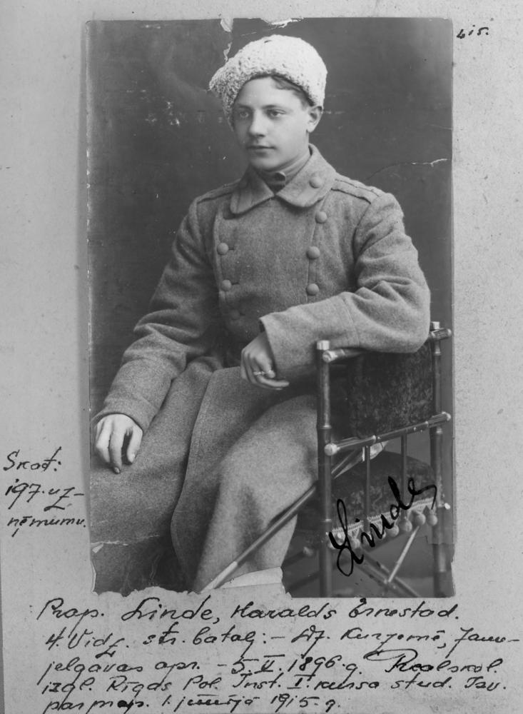 Krievijas impērijas armijas 4. Vidzemes latviešu strēlnieku bataljona praporščiks Haralds Linde Ernests dēls (dzimis 1896. gada 5. maijā Kurzemē, Jaunjelgavas apriņķī). Izglītība - reālskola, Rīgas Politehniskā institūta 1. kursa students. Pakāpe no 1915. gada 1. jūnija. Portrets.