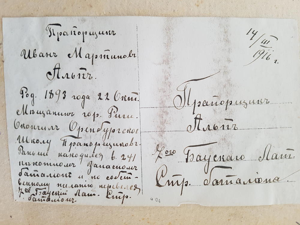 Krievijas impērijas armijas 7. Bauskas latviešu strēlnieku bataljona praporščika Jāņa Alpa ar tinti rakstītā anketa krievu valodā. Fotokopija.