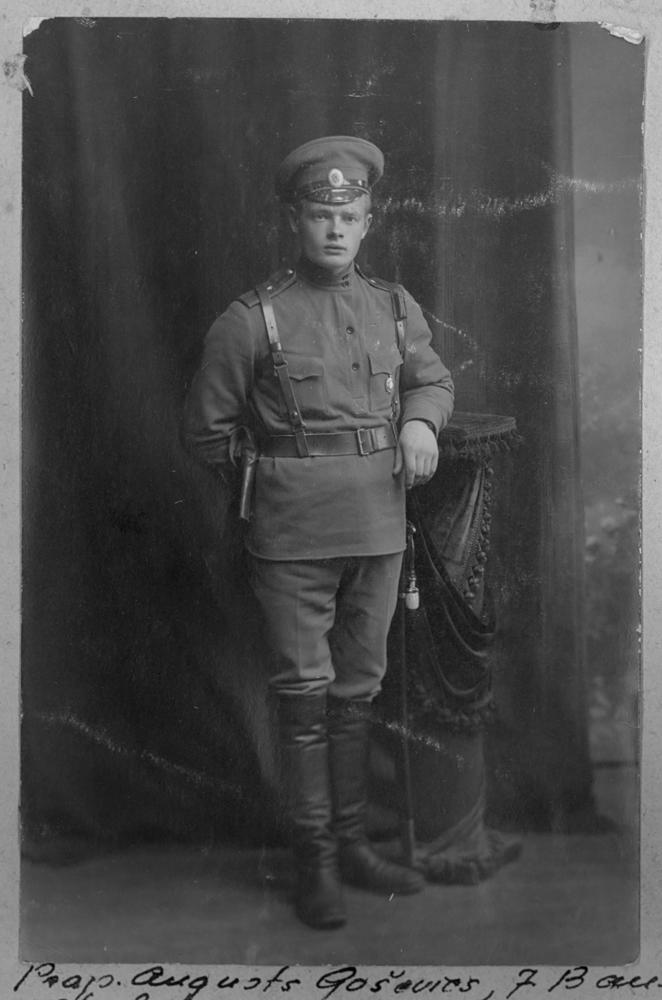 Krievijas impērijas armijas 7. Bauskas latviešu strēlnieku bataljona praporščiks Augusts Goševics Jāņa dēls (dzimis 1894. gada 20. jūnijā Bauskas apriņķa Nīzeres "Poļos" (tagad Stelpes pagasts). Izglītība - Jelgavas skola un Rīgas N. Mironova privātā komercskola. 1914. gada 4. decembrī brīvprātīgi iestājies dienestā, 1915. gada 18. februārī iestājās Maskavas kara skolā un pabeidza 4. decembrī. Saņēmis pakāpi iestājās dienestā 7. Bauskas latviešu strēlnieku bataljona 2. rotas ložmetējnieku komandā. Krita kaujās 1916. gada 23. decembrī un apglabāts Rīgas Brāļu kapos. Portrets.