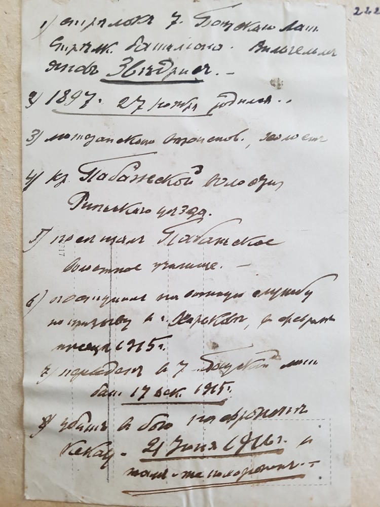 Krievijas impērijas armijas 7. Bauskas latviešu strēlnieku bataljona strēlnieka Vilhelma Zviedra ar tinti rakstītā anketa. Fotokopija.