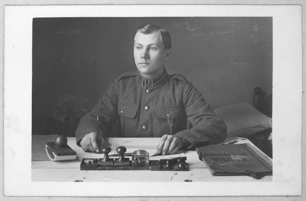 Latvijas armijas ierēdnis, seržants pie darba galda. Portrets interjerā.