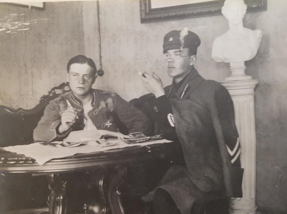 Latvijas armijas virsnieki atpūtas brīdī. No kreisās puses: 1. virsleitnants (?) jātnieku eskadriļas formas tērpā; 2. Neatkarības rotas leitnants Pēteris Mālītis.