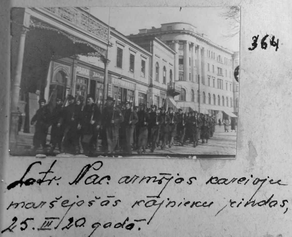Latvijas armijas kājnieku pulka karavīri maršē pa Elizabetes ielu (fonā ēka Elizabetes ielā 55) Rīgā.