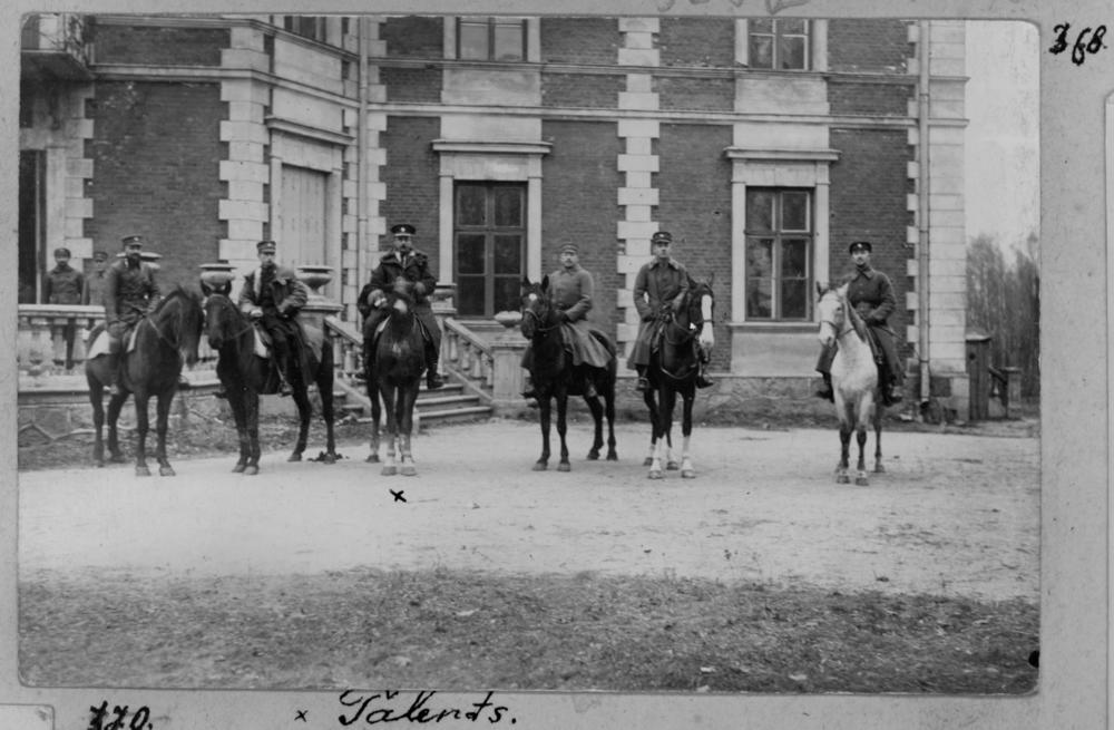 Lielbritānijas valdības komisārs Baltijas valstīs kopā ar Latvijas armijas virsniekiem zirgos. No kreisās puses: 3. Lielbritānijas valdības komisārs Stīvens (Džordžs) Talents.