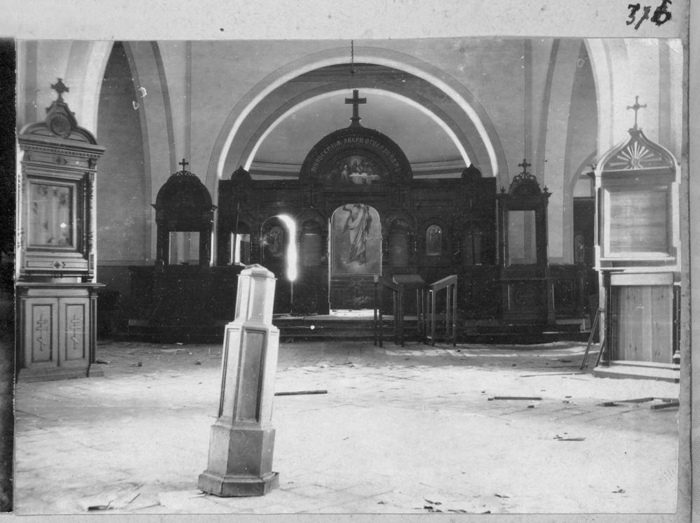 Pirmā pasaules kara postījumi pareizticīgo baznīcā centrālā altārī un sānu velvēs.