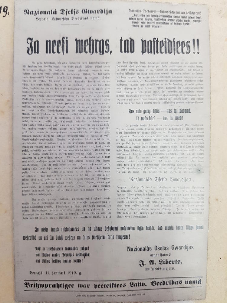 Uzsaukuma par brīvprātīgo iestāšanos Latviešu dzelzs gvardijā skrejlapa, ko izdeva pulkvedis - majors J. A. Liberts 1919.gada 11. janvārī Liepājā.