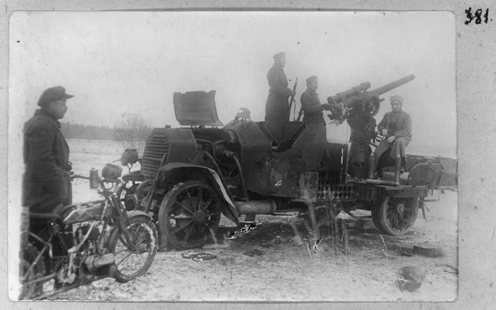Latvijas armijas 5. Cēsu kājnieku pulka Velosipēdistu rotas iegūto trofeju bruņoto auto ar zenītlielgabalu apseko karavīri.