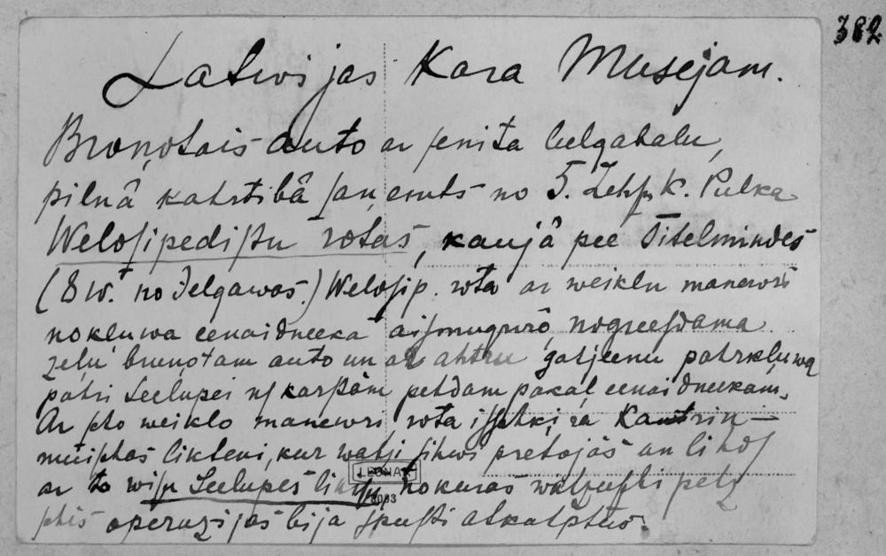 Atskaite Latvijas kara muzejam par Latvijas armijas 5.Cēsu kājnieku pulka Velosipēdistu rotas iegūto trofeju - bruņoto auto ar zenītlielgabalu.