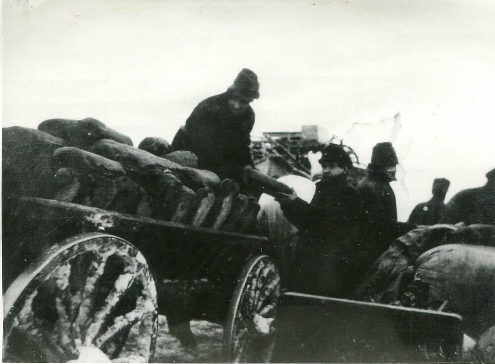 Maizes dalīšana no pajūga Latvijas armijas karavīriem. Skats ziemā.