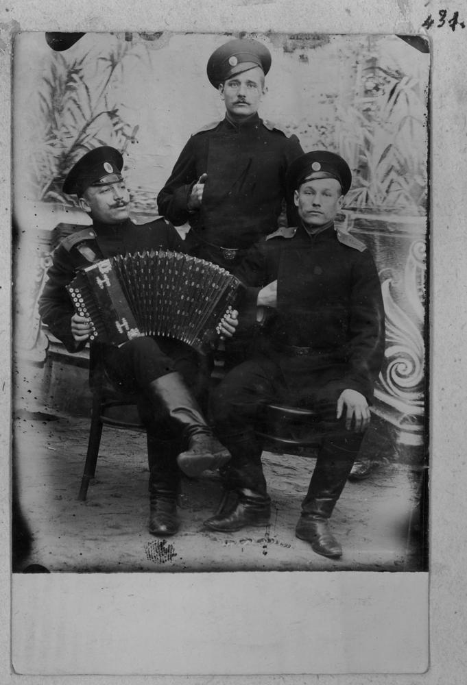 Krievijas impērijas armijas karavīri (latviešu strēlnieki (?)) Pirmā pasaules kara laikā. Vidū virsnieks Pavasars. Grupas foto.