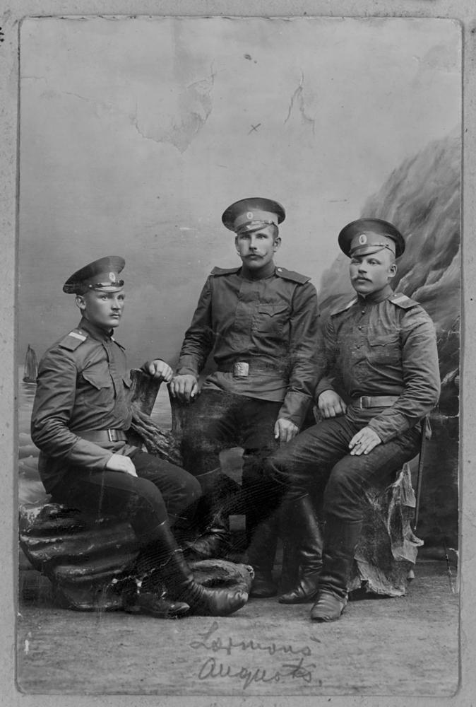 Krievijas impērijas armijas karavīri, iespējams latviešu strēlnieki. Vidū Augusts Laimons. Grupas foto.