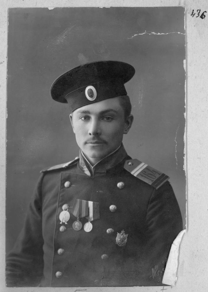 Krievijas impērijas armijas 164. Zakataļskas kājnieku pulka karavīrs, latviešu zemessargs Jānis Taurenis. Kritis Austrumprūsijā 1914. gada 21. novembrī. Portrets.