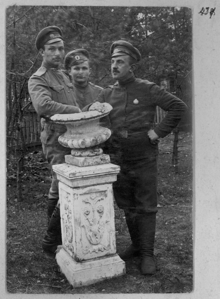Krievijas impērijas armijas 8. Valmieras latviešu strēlnieku bataljona strēlnieki atpūtas laikā Bulduros. No kreisās puses: Jansens, Voldemārs (?) Tripka, Eglītis. Grupas foto.