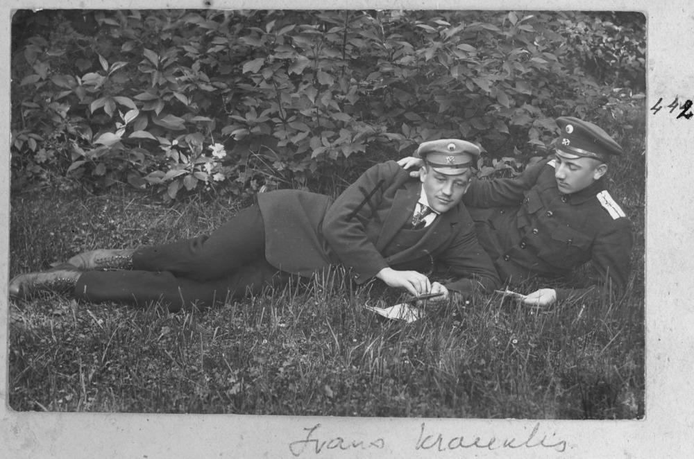 Krievijas impērijas armijas latviešu strēlnieki (?) atpūtā. No kreisās puses: Jānis (Ivans) Krauklis. Dubultportrets.