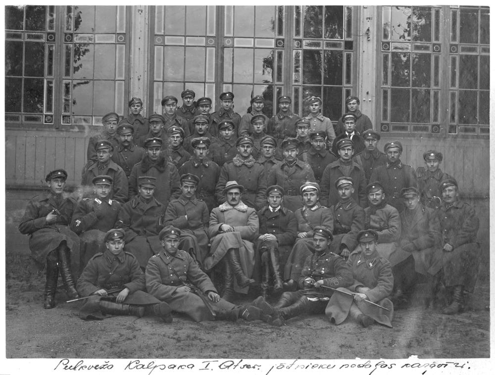 Latvijas armijas 1. latviešu atsevišķais bataljona jeb Kalpaka bataljona (komandieris Oskars Kalpaks) Latviešu atsevišķās jātnieku nodaļas (Artuma - Hartmaņa jātnieku vienība, vēlāk 1. atsevišķais eskadrons) karavīri. Grupas foto.