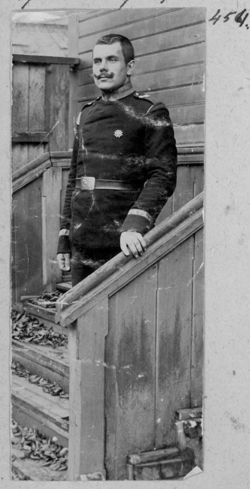 Krievijas impērijas armijas karavīrs (iespējams strēlnieks) uz mājas sliekšņa. Portrets.