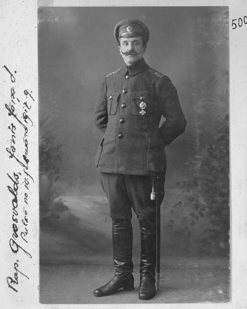 Krievijas impērijas armijas 1. Daugavgrīvas latviešu strēlnieku bataljona praporščiks Jānis Grosvalds Jāņa dēls. Dzimis Cēsu pagastā, zemkopis. 1914. gadā kā brīvprātīgais pieteicās dienestā. 1916. gada 5. septembrī nosūtīts mācīties uz Saratovas praporščiku skolu. No 1917. gada 10. februāra 1. Daugavgrīvas latviešu strēlnieku pulka sastāvā. 1918. gada 20. decembrī brīvprātīgi iestājies Latvijas Armijā, piedalījās Latvijas Brīvības cīņās un par kauju nopelniem paaugstināts par pulkvedi - leitnantu. Turpināja dienestu un 1931. gadā paaugstināts pulkveža pakāpē. Apbalvojumi – Lāčplēša kara ordeņa un Triju Zvaigžņu ordeņa kavalieris. Portrets.