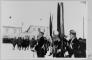 Latvijas Neatkarības rotas karoga iesvētīšanas pasākumā studenti ar karogiem ierindā.