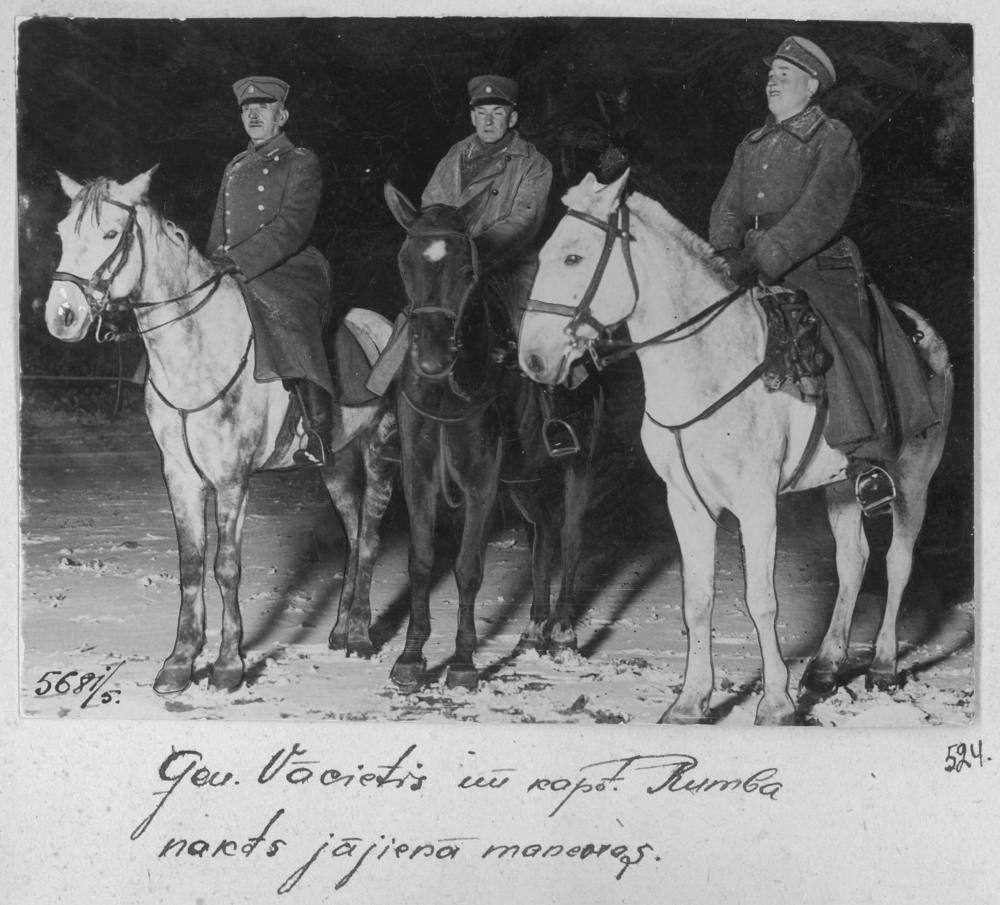 Latvijas virsnieki zirgos nakts pārgājienā armijas manevru laikā. No kreisās puses: 1. Latvijas armijas ģenerālis Mārtiņš Vācietis, 2. kapteinis Alberts Rumba.