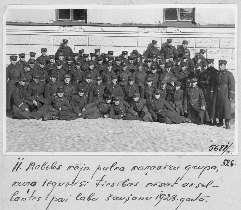 Latvijas armijas 4. Zemgales divīzijas 11. Dobeles kājnieku pulka karavīri, kuri par labām sekmēm 1928. gada sacensībās šaušanā ieguva tiesības nēsāt akselbantes. Pulka dislokācijas vieta no 1920. gada novembra ir Daugavpils cietoksnis. Grupas foto.