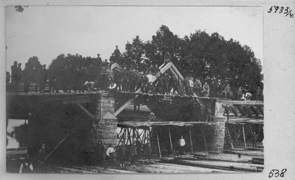 Latvijas armijas karaspēka tehniskās daļas karavīri, kas piedalās uz vecajiem mūra balstiem atjaunojamā koka tilta pāri Aiviekstei netālu no Lubānas pils būvniecības darbos.