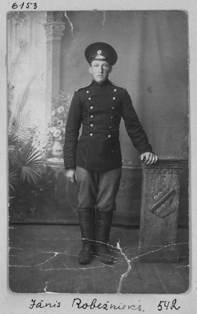 Latviešu strēlnieks Jānis Robežnieks, kurš dienēdams Latvijas armijas 6. Rīgas kājnieku pulka 12.rotas kā kaprālis pirmais kritis 1919. gada 8. oktobrī pie Jelgavas šosejas kaujā pret Bermonta - Avalova karaspēku. Portrets studijā.