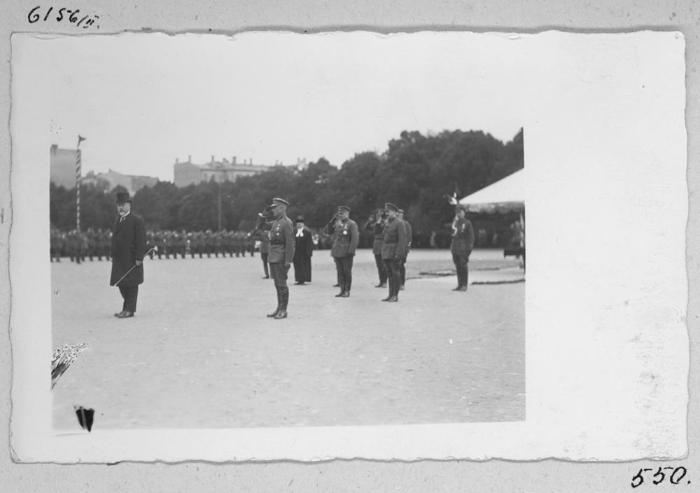 Latvijas armijas 6. Rīgas kājnieku pulkam Rīgas pilsēta dāvina karogu, kam par godu Esplanādes laukumā noritēja parāde. No kreisās puses: 1. kara ministrs Gustavs Zemgals, 2. pulka komandieris, pulkvežleitnants Jānis Priede.