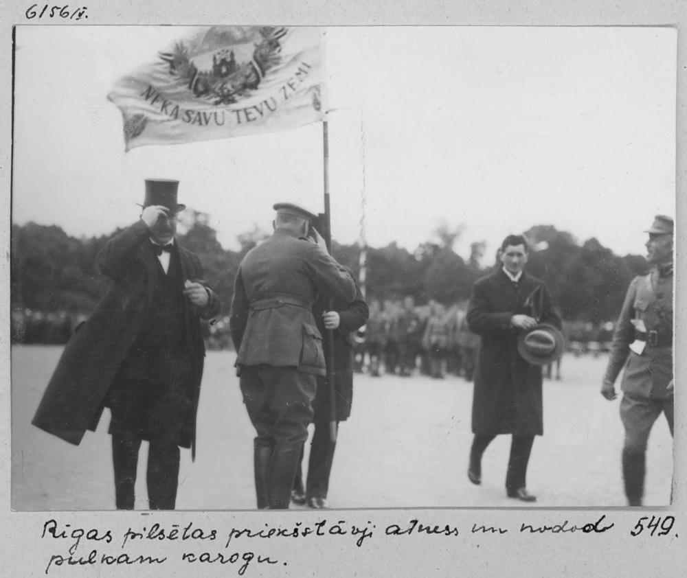 Latvijas armijas 6. Rīgas kājnieku pulkam Rīgas pilsēta dāvina karogu, kam par godu Esplanādes laukumā noritēja parāde. Rīgas pilsētas galva Alfrēds Andersons pasniedz karogu pulka komandierim, pulkvežleitnantam Jānim Priedem. No kreisās puses: 1. kara ministrs Gustavs Zemgals.