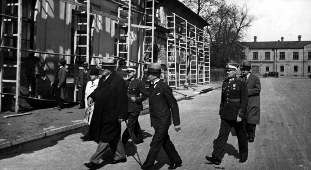 Latvijas Valsts un Ministru prezidents Kārlis Ulmanis (priekšplānā) iepazīstas ar Rīgas pils pārbūves darbiem. Valsts prezidentu pavada no labās: 1. Rīgas pils komandants (1936-1940), pulkvedis, dzejnieks (pseidonīmi Rūdis, Raimonds) Raimonds Bebris, 2. Valsts prezidenta sekretārs (1922-1940) un Rīgas pils pārbūves komisijas loceklis Jānis Grandaus, 3. Valsts prezidenta adjutants pulkvežleitnants Miervaldis Lūkins, 4. Kārļa Ulmaņa sekretārs Jānis Cimmermanis (no 1939. gada Rudums).