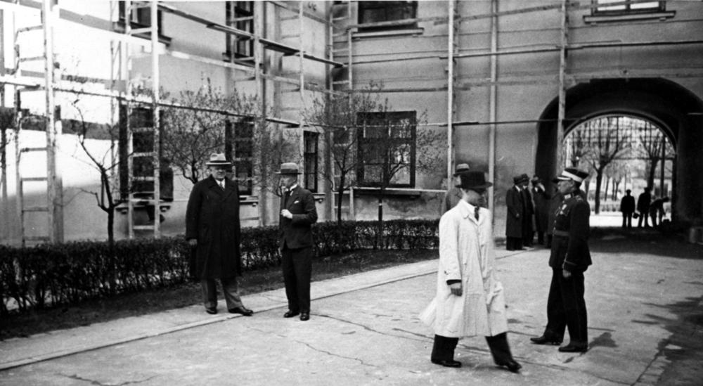 Latvijas Valsts un Ministru prezidents Kārlis Ulmanis iepazīstas ar Rīgas pils pārbūves darbiem. No kreisās: 1. Kārlis Ulmanis, 2. Valsts prezidenta sekretārs (1922-1940) un Rīgas pils pārbūves komisijas loceklis Jānis Grandaus, 3. Rīgas pils komandants (1936-1940), pulkvedis, dzejnieks (pseidonīmi Rūdis, Raimonds) Raimonds Bebris. Priekšplānā Kārļa Ulmaņa sekretārs Jānis Cimmermanis (no 1939. gada Rudums).