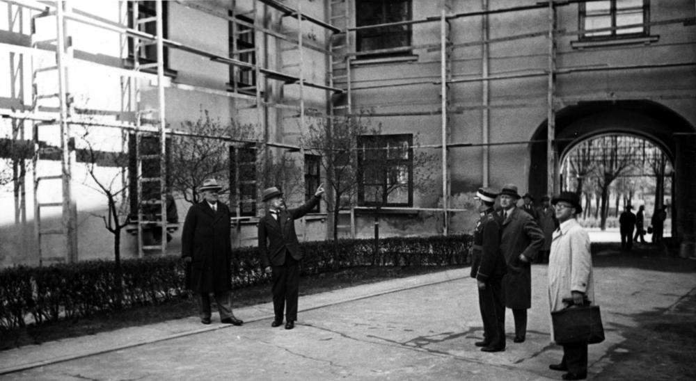 Latvijas Valsts un Ministru prezidents Kārlis Ulmanis iepazīstas ar Rīgas pils pārbūves darbiem. No kreisās: 1. Kārlis Ulmanis, 2. Valsts prezidenta sekretārs (1922-1940) un Rīgas pils pārbūves komisijas loceklis Jānis Grandaus, 3. Rīgas pils komandants (1936-1940), pulkvedis, dzejnieks (pseidonīmi Rūdis, Raimonds) Raimonds Bebris. Priekšplānā Kārļa Ulmaņa sekretārs Jānis Cimmermanis (no 1939. gada Rudums).